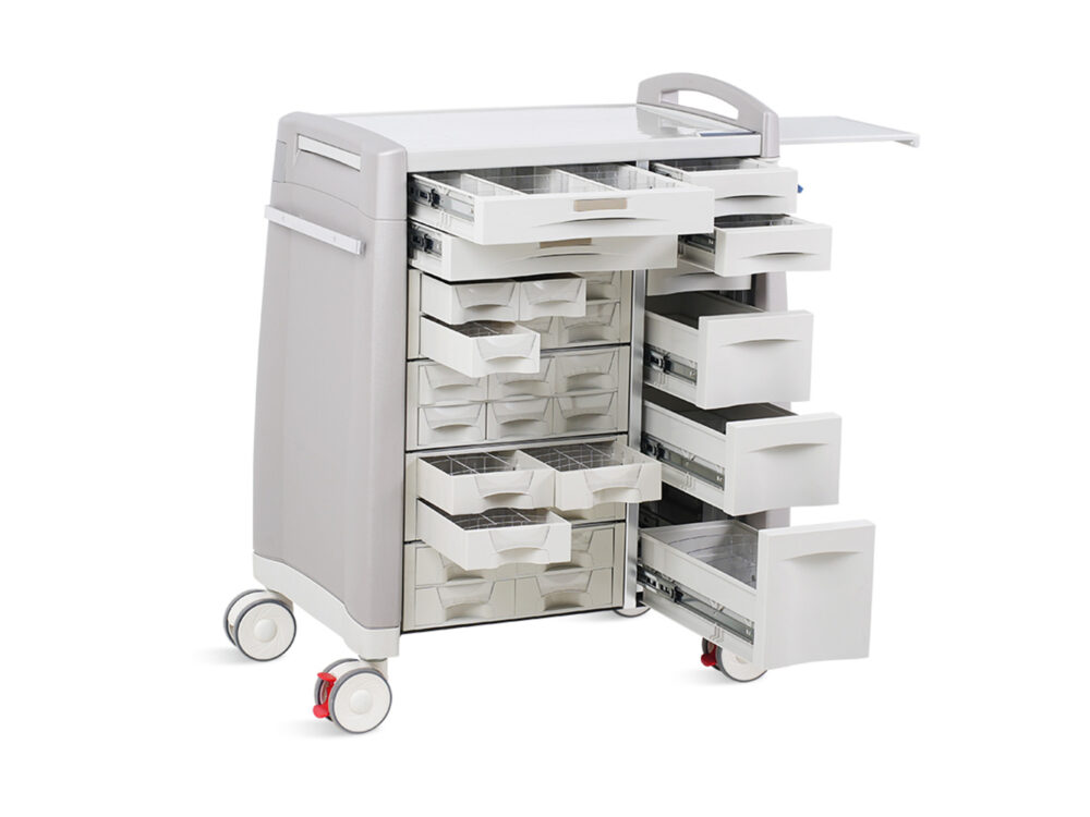 The IMPETU CL1 Nursing Trolley features a sleek, durable design with antibacterial ABS construction, offering exceptional stability and easy cleaning. Its multi-layer drawers with silent damping slides and customizable medicine grids ensure organized, quiet, and efficient access.